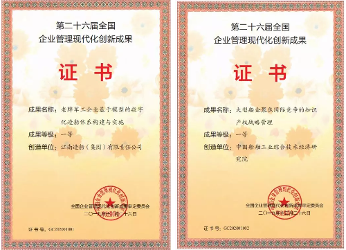 所属江南造船(集团)有限责任公司申报的《老牌军工企业基于模型定义的数字造船新模式构建与实施》和中国船舶工业综合技术经济研究院申报的《大型船企聚焦国际竞争的知识产权战略管理》分获国家级一等奖。本届仅有30项一等奖,另有4项成果荣获国家级二等奖,获奖成果数量创船舶行业历年最好成绩。
