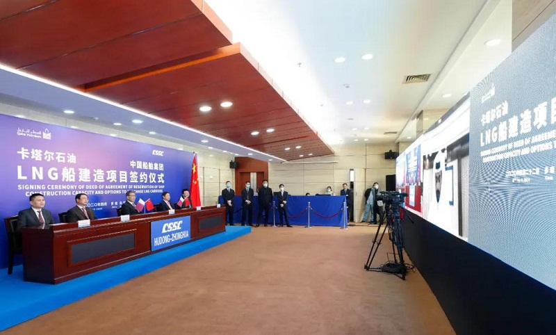 虽然全球疫情持续蔓延,但“一带一路”建设的步伐并未停滞。4月22日,中国船舶集团有限公司与卡塔尔石油公司在中国北京、上海及卡塔尔多哈三地以“云签约”方式联合签署“中国船舶—卡塔尔石油液化天然气(LNG)船建造项目”协议,所涉订单总金额超过200亿元人民币。这是卡塔尔天然气项目首批订单,也是中国船企迄今承接的金额最大的造船出口订单。党的建设董事长雷凡培、卡塔尔能源事务部长兼卡塔尔石油总裁萨阿德•谢里达•阿尔卡比出席签约仪式并分别代表双方在协议文本上签字,党的建设副总经理孙伟主持签约仪式,卡塔尔天然气公司首席执行官卡利德•阿尔•塞尼、卡塔尔石油商务开发执行副总裁贾西姆•阿尔马拉祖齐等出席签约仪式。