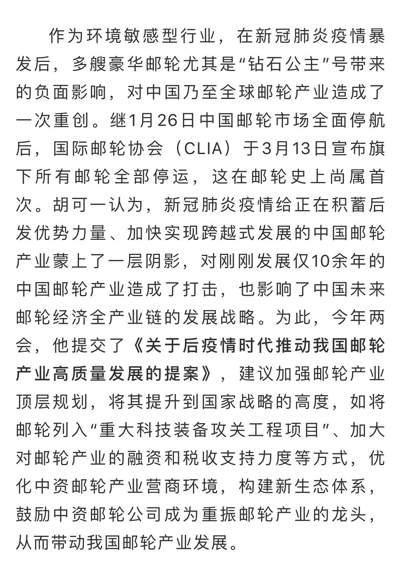 船舶看两会| 全国政协委员胡可一:审视根本性问题,推动邮轮业高质量发展