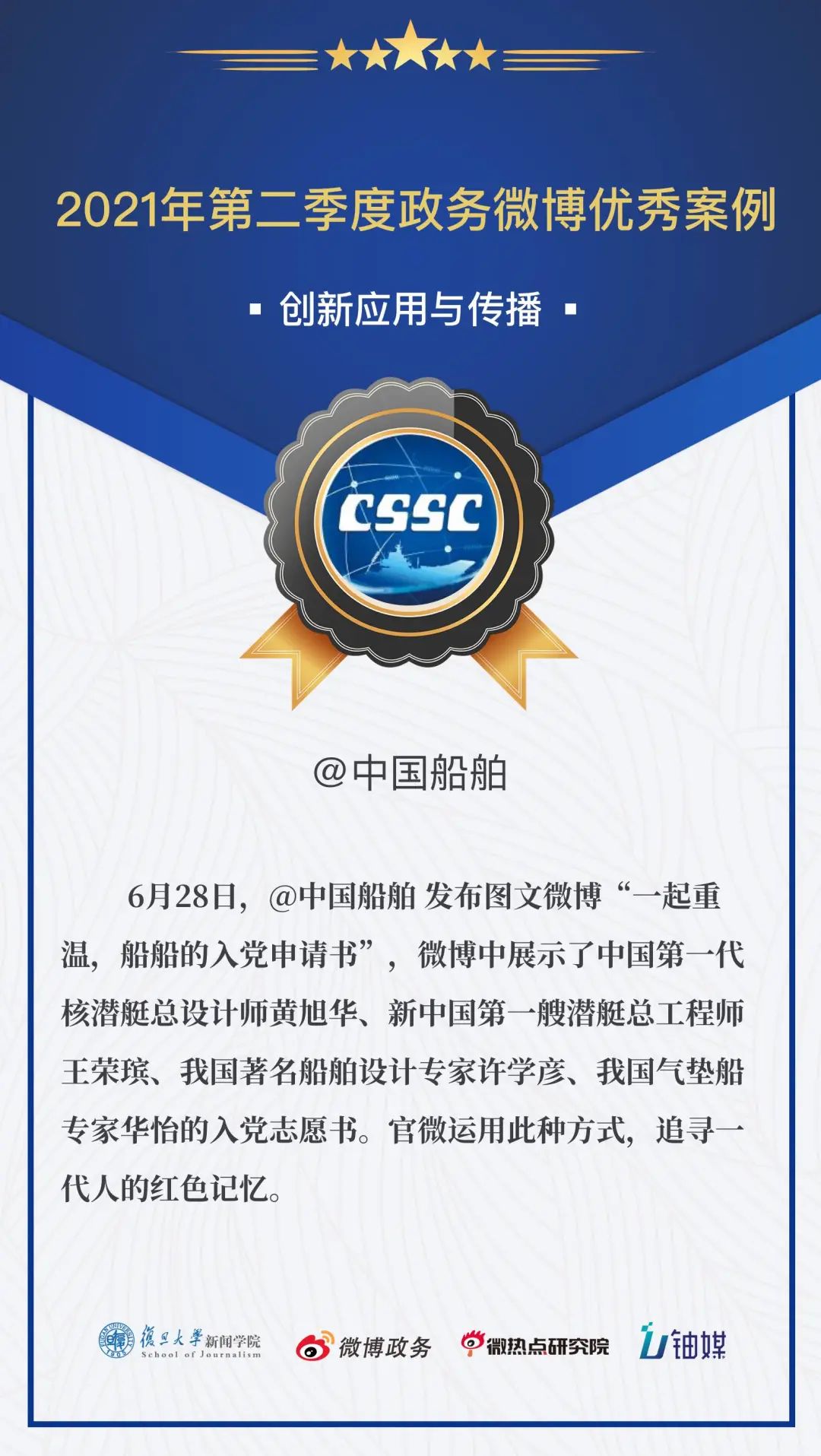 在几百个微博政务账号、几千个微博政务优秀案例的评选中,@中国船舶 凭借图文微博“一起重温,船船的入党申请书”,再一次拿下“创新应用与传播”的奖励,真的是太棒了!
