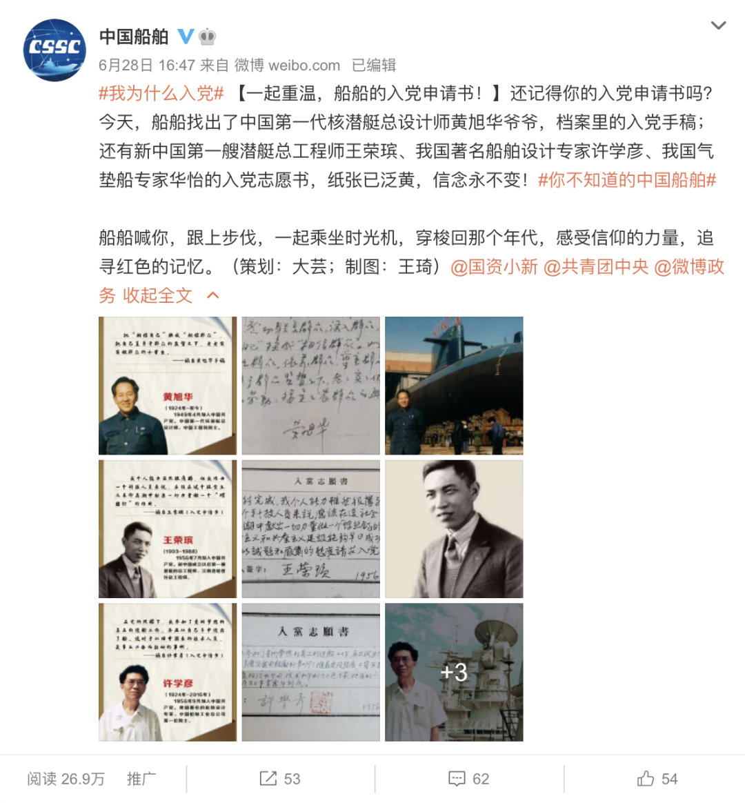 这篇微博展示了中国第一代核潜艇总设计师黄旭华、新中国第一艘潜艇总工程师王荣瑸、我国著名船舶设计专家许学彦、我国气垫船专家华怡的亲笔入党志愿书,用一种时空穿越的方式,追寻一代人的红色记忆,用船舶人的方式,庆祝建党百年。