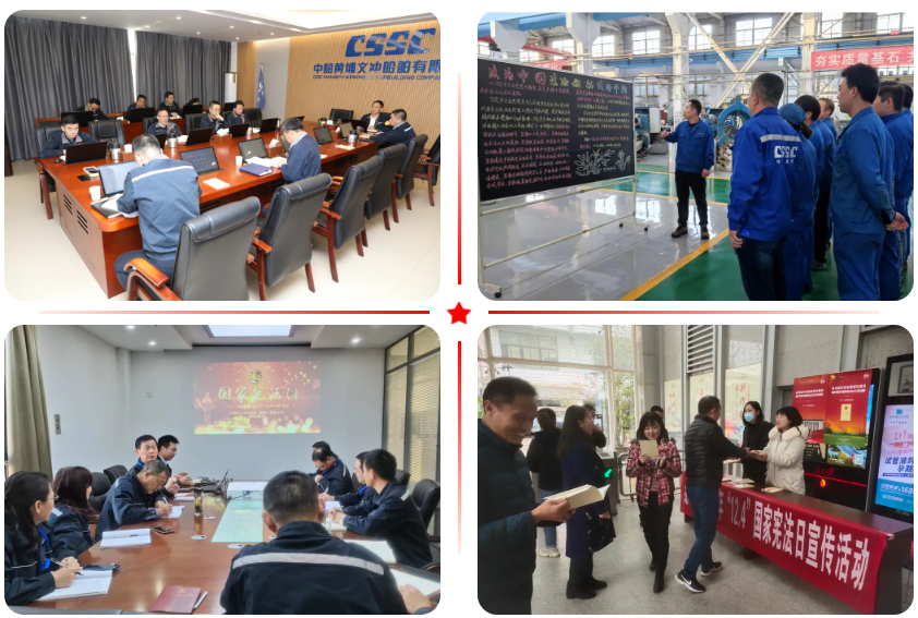 ▲ 黄埔文冲、昆船公司、七〇四所、七一二所等单位召开法治建设委员会会议进行专题法治学习;国际工程公司举办了诚信合规手册发布仪式;渤船集团、平阳重工、环境公司、陕柴重工等单位发放《习近平法治思想学习纲要》等学习资料。