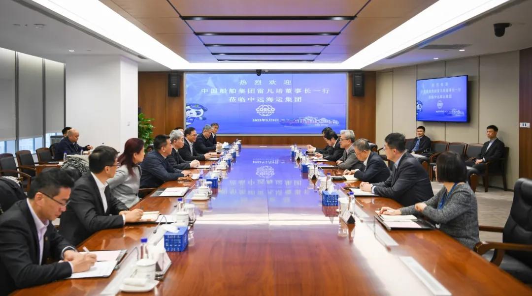 2月9日,中国船舶集团有限公司党组书记、董事长雷凡培,党组副书记、总经理杨金成一行赴中远海运大厦拜会中国远洋海运集团有限公司党组书记、董事长万敏,党组副书记、总经理付刚峰。双方互贺壬寅虎年新春,围绕深入贯彻落实国家重大战略,就进一步加强绿色燃料技术研发应用、船舶与航运业全产业链构建等领域的交流合作,携手推动我国航运业和造船业高质量发展进行了深入探讨并达成广泛共识。党的建设党组成员、副总经理孙伟、盛纪纲,中远海运集团党组成员、副总经理、总会计师孙云飞参加会谈。