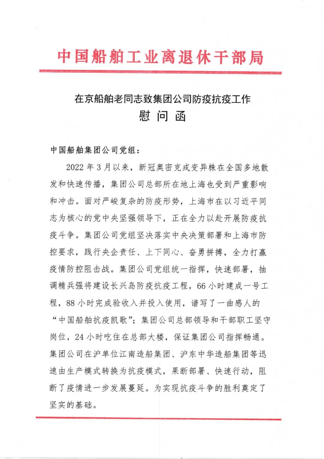 中国船舶人的抗疫行动和斗争场景,令人深受感动、备受鼓舞!中国船舶离退休老领导老同志给集团公司党组发去慰问信;船舶老年大学学员引吭高歌,歌颂抗疫斗争精神。
