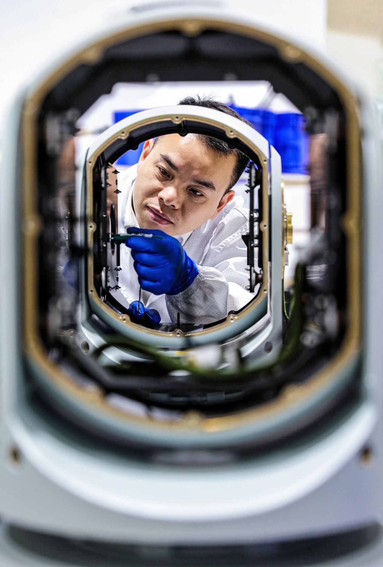 七一七所技术人员正在装调光轴,确保光路的稳定传导,在精确装调中坚守本心、求精求新,以匠心确保产品精度。