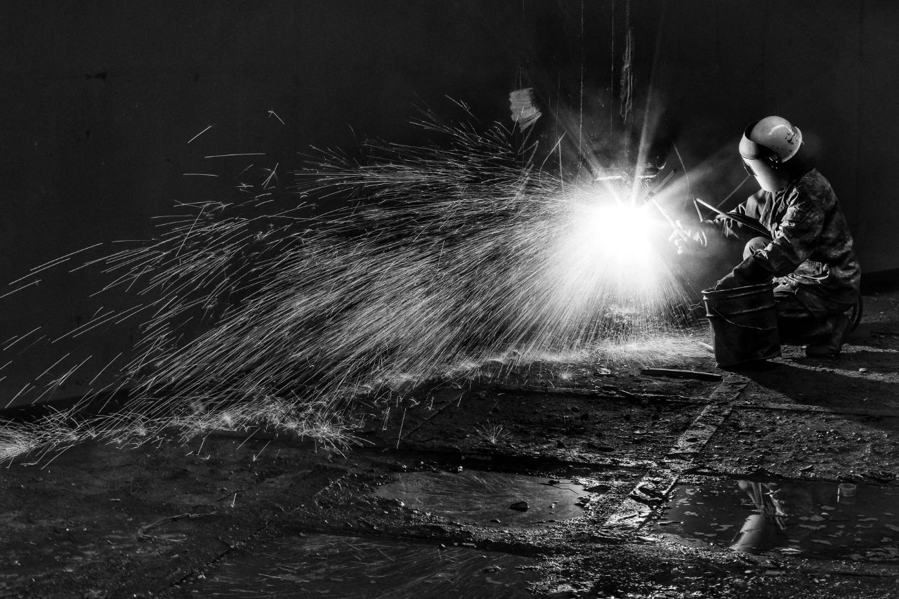 利用慢门记录造船工人在气刨时的工作场面。
