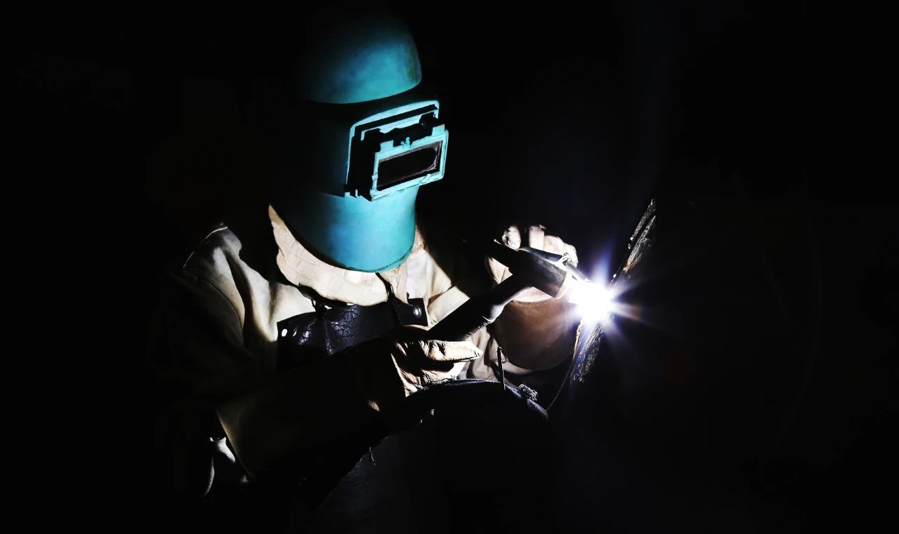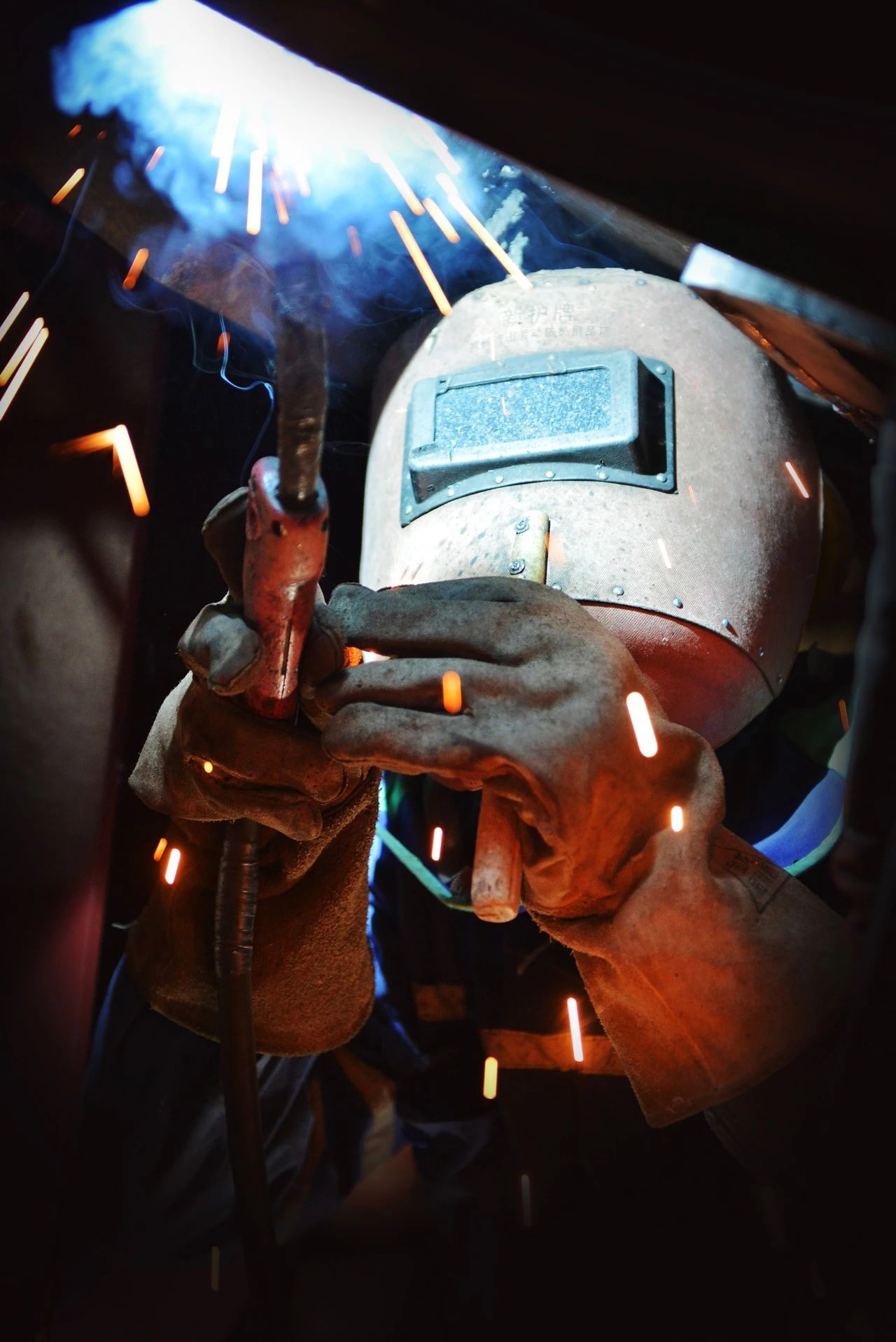 一位“全副武装”正在进行焊接作业的焊工,焊花飞舞在狭小的工间里,折射出如彩云般的景象,犹如巨人正在“补天”。