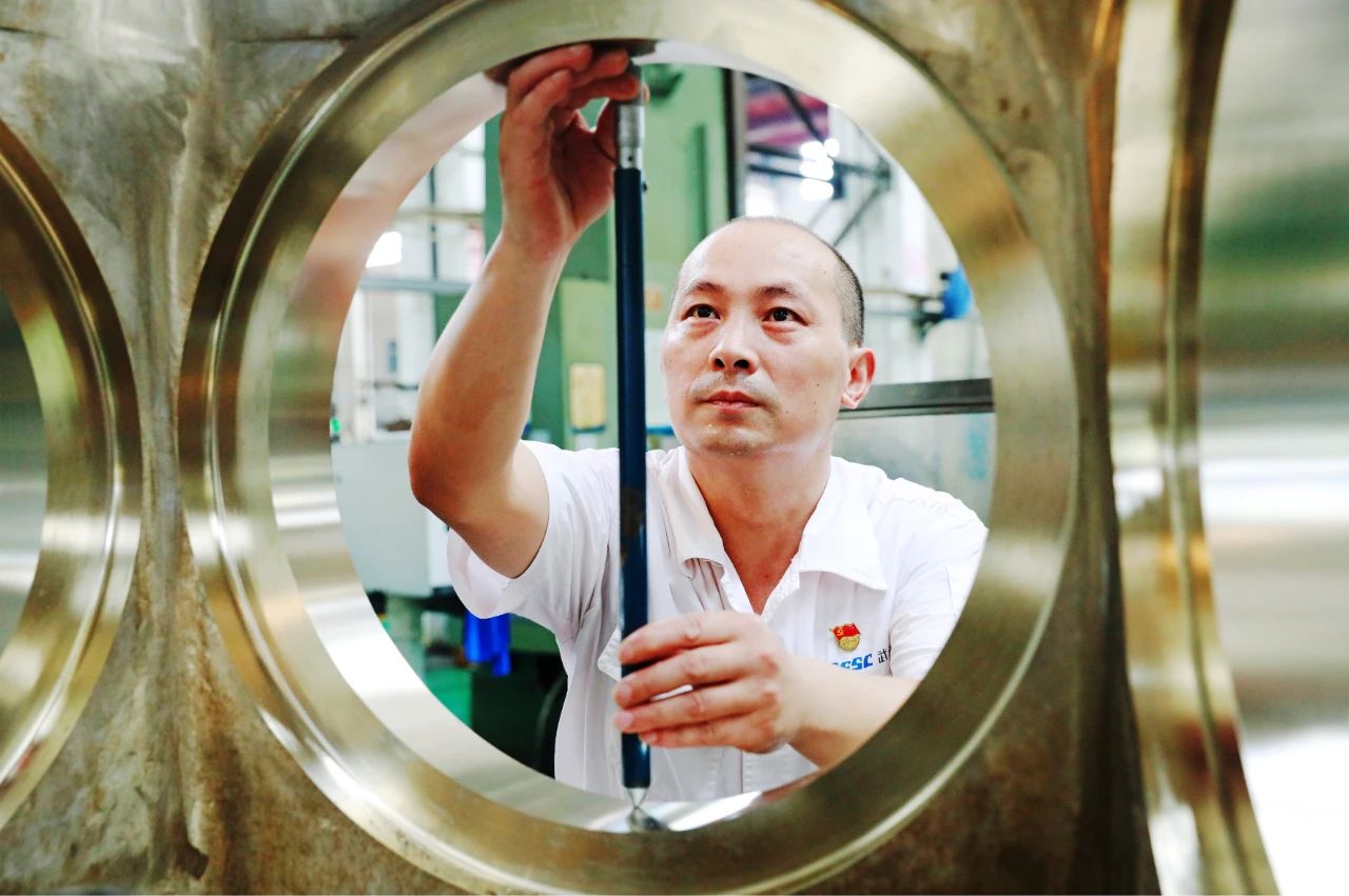 在武汉船机平台生产现场,一名机床操作师傅,正在对加工后的零件进行检测,专注的表情展现了船舶人严把质量关,人品以诚心为本,企品以恒心为要,产品以匠心为重的精神风貌。