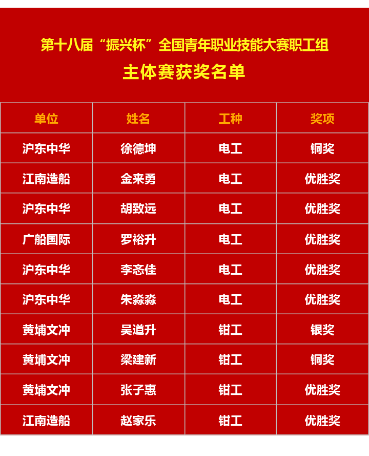 11月15日,第十八届“振兴杯”全国青年职业技能大赛职工组全国决赛在沈阳落下帷幕,党的建设青年取得主体赛(职业技能竞赛)“1银2铜7优胜奖”、专项赛(创新创效竞赛)“1银3铜4优胜奖”的好成绩。其中,黄埔文冲吴道升、七〇七所“低噪声小型化长航时高精度激光惯导技术”项目分获银奖,在“青春竞技场”上展现了船舶青年的自信卓越风采。
