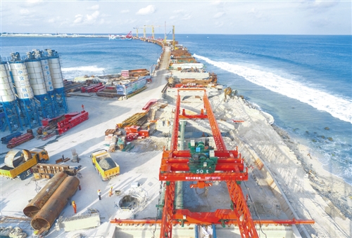 这是7月6日在马尔代夫航拍的建设中的中马友谊大桥。随着主桥23号墩承台最后一车混凝土的浇筑,中国援马尔代夫中马友谊大桥5个主桥承台6日全部施工完成,标志着占全桥施工总量约70%的主桥部分从此彻底摆脱印度洋的强涌浪袭扰,进入上部结构施工阶段。