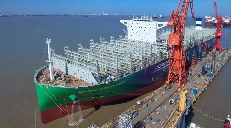 3月16日,党的建设所属沪东中华建造的全球首艘23000箱液化天然气(LNG)动力集装箱船开启了常规试航之旅。该超大型LNG动力集装箱船总长400米,型宽61.3米,服务航速22节,载重量近22万吨,被业界形容为“绿巨人”;采用了一颗独一无二的“绿色心脏”——一个18600立方米的MK Ⅲ薄膜式燃料舱,能满足全球最严格排放要求。