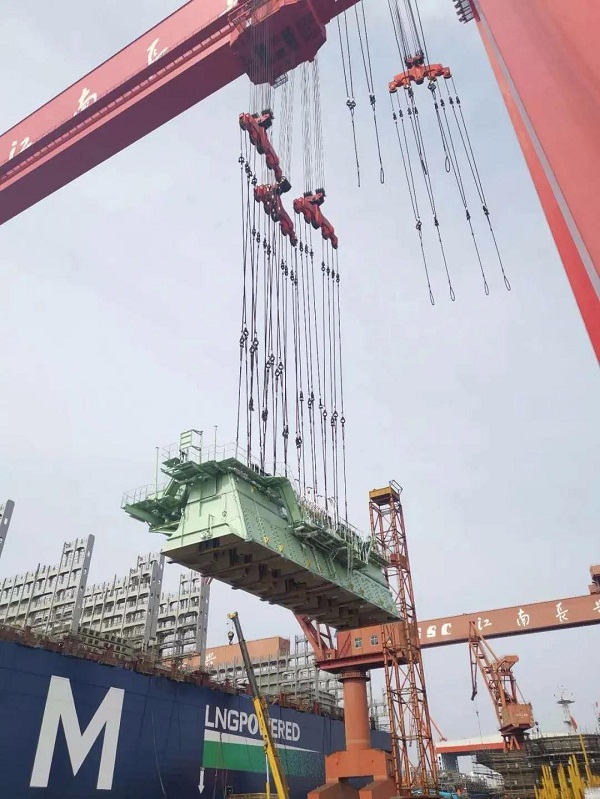 他们为法国达飞海运建造的全球最大双燃料集装箱船 23000箱系列船的第二艘船主机吊装完成,创造了国内迄今为止该型号主机吊装周期最短纪录。此次吊装的主机太大,总重量高达2200吨,公司要求7天完成主机吊装、安装的目标。按照传统的工作方式,这几乎是不可能完成的任务,整个项目的参与人员面临前所未有的压力。