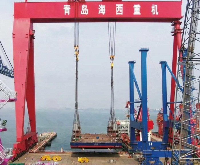 在该项目的前期建造策划阶段,海西重机没有采用常规船坞下水或滑移下水方式,而是大胆提出利用1600吨龙门吊整体吊装下水的设想。经过一系列重量预估及方案论证,最终核定吊装下水重量接近1440吨。
