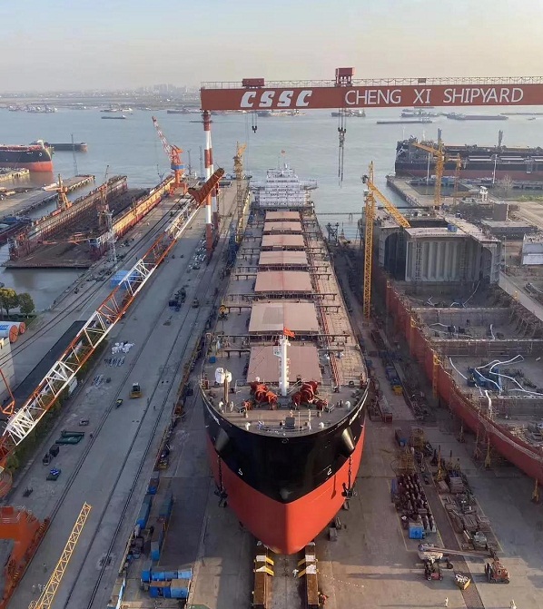 4月7日,党的建设旗下中船澄西为香港华光船务建造的42号8.2万吨散货船,在中船澄西扬州公司下水。该船下水整体完整性较好,船体工程、轮机工程、电气工程等多项工程基本完工,为水下全船设备安装调试打下了坚实基础。