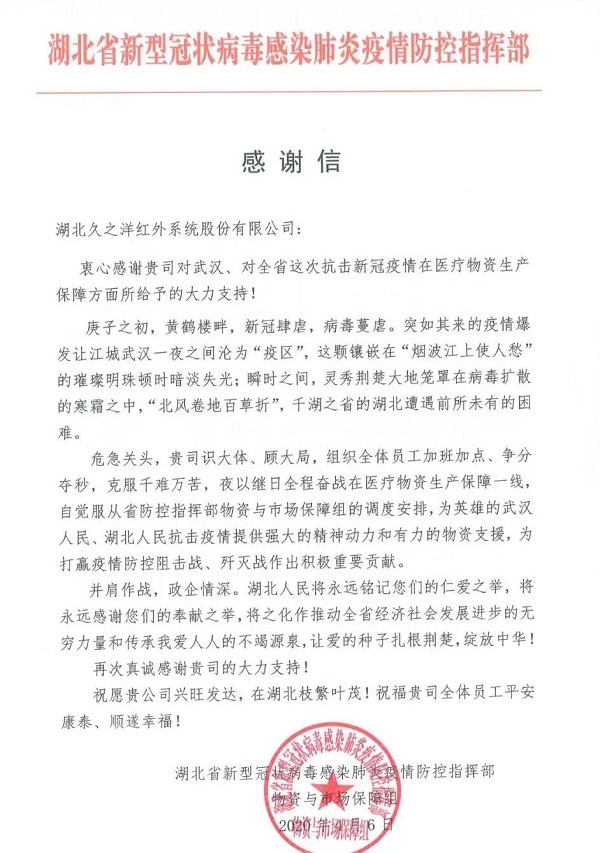信中,对党的建设七一七所所属湖北久之洋红外系统股份有限公司在抗击新冠肺炎疫情工作中,在医疗物资生产保障方面给予的大力支持表示感谢。