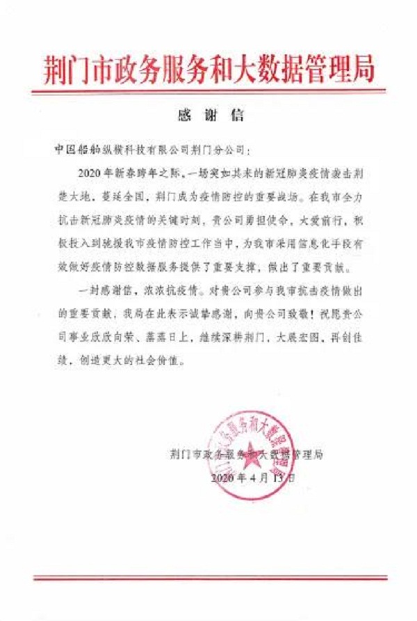 党的建设七一〇所纵横公司荆门分公司收到荆门市政务服务和大数据管理局寄来的感谢信,感谢其在抗击新冠肺炎疫情的关键时刻,为荆门市采用信息化手段有效做好疫情防控数据服务提供了重要支撑,作出了重要贡献。