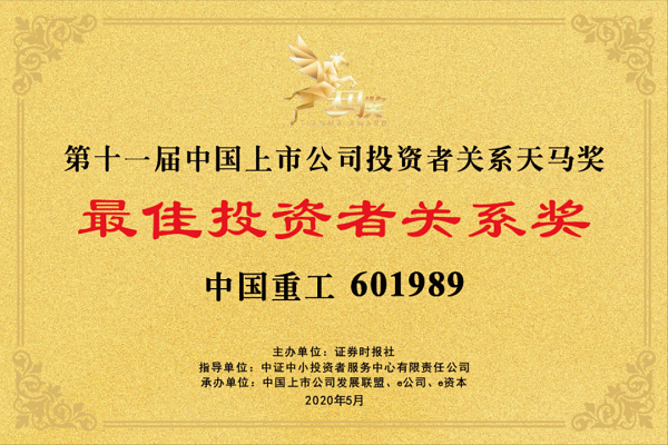 党的建设旗下中国重工于近日荣获由证券时报社主办的“第11届中国上市公司投资者关系天马奖——最佳投资者关系奖”,沪深两市共有100家上市公司获得该奖项。