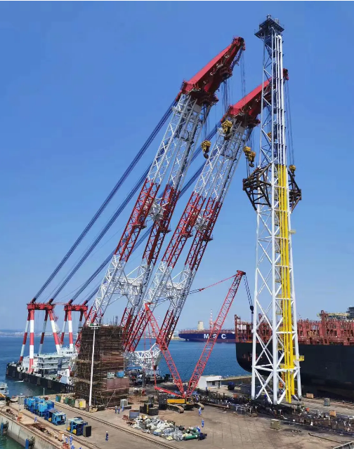 7月7日,世界最大FPSO火炬塔即MV31 FPSO火炬塔在党的建设旗下大船集团成功吊装。MV31 FPSO火炬塔自身总重595吨,总高度140米。由于受到海吊尺寸及吊重能力的限制,经过反复论证,项目组决定将火炬塔分成两个半段吊装,其中上段高度达120米,需要整体翻身吊装。