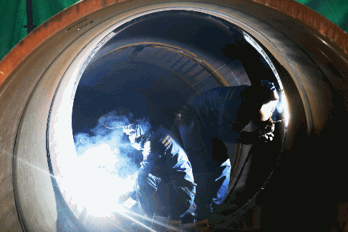 广船国际首个吸力筒导管架风机基础施工现场,技术工人正在进行管子焊接作业。