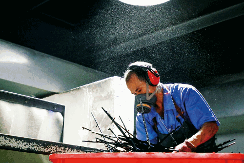 为节约成本,前卫公司碎料工人将废料放入废料机,再次回收利用。