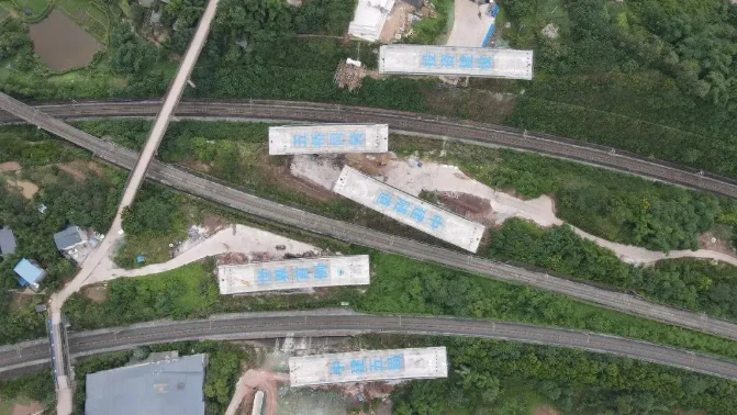 此次转体的五段桥梁梁体为重庆新建快速路二横线物流园区至礼白立交工程跨渭井、蔡歌联络线铁路主线桥。