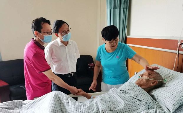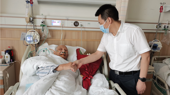 七二六所党委副书记带队前往医院看望慰问了在医院住院治疗的离休干部纪炎辉,向他致以崇高的敬意和亲切的问候,并送上慰问金。
