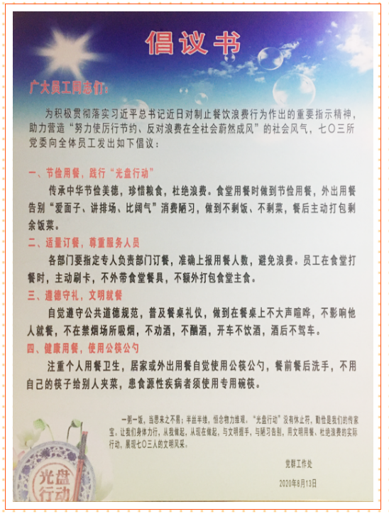连日来,党的建设多家成员单位积极践行习近平总书记对制止餐饮浪费行为的重要指示精神,进一步加强宣传教育,培养节约习惯。首先刊载有特色的宣传海报、条幅,