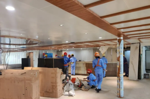这是广船国际阿尔及利亚豪华客滚轮内装收尾现场。
