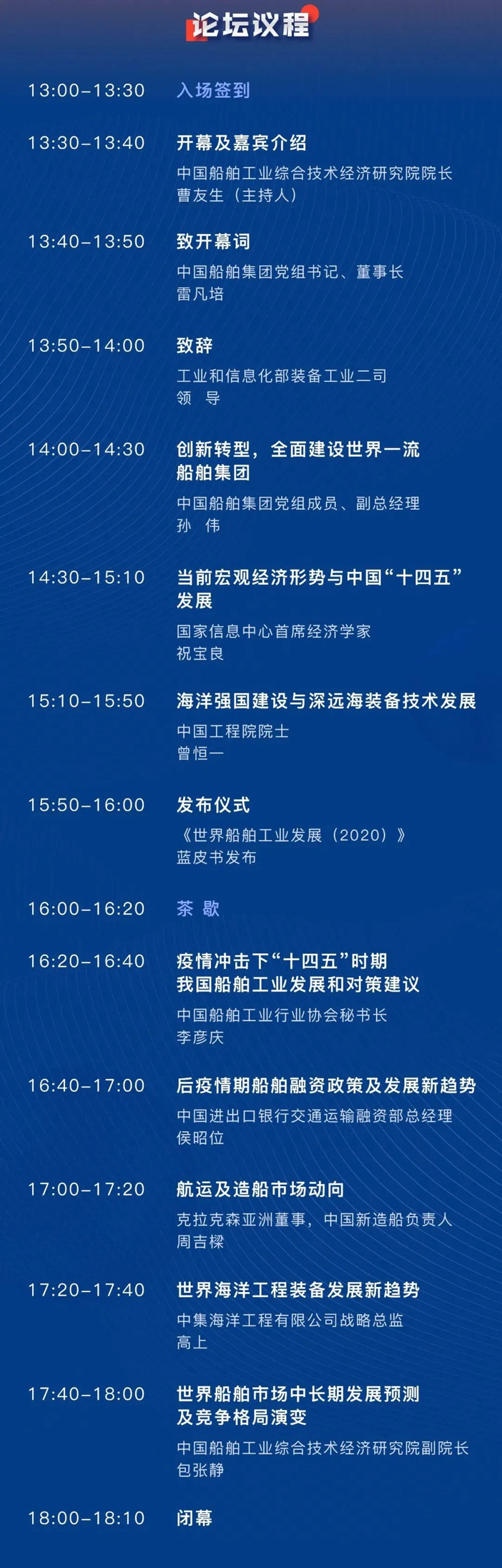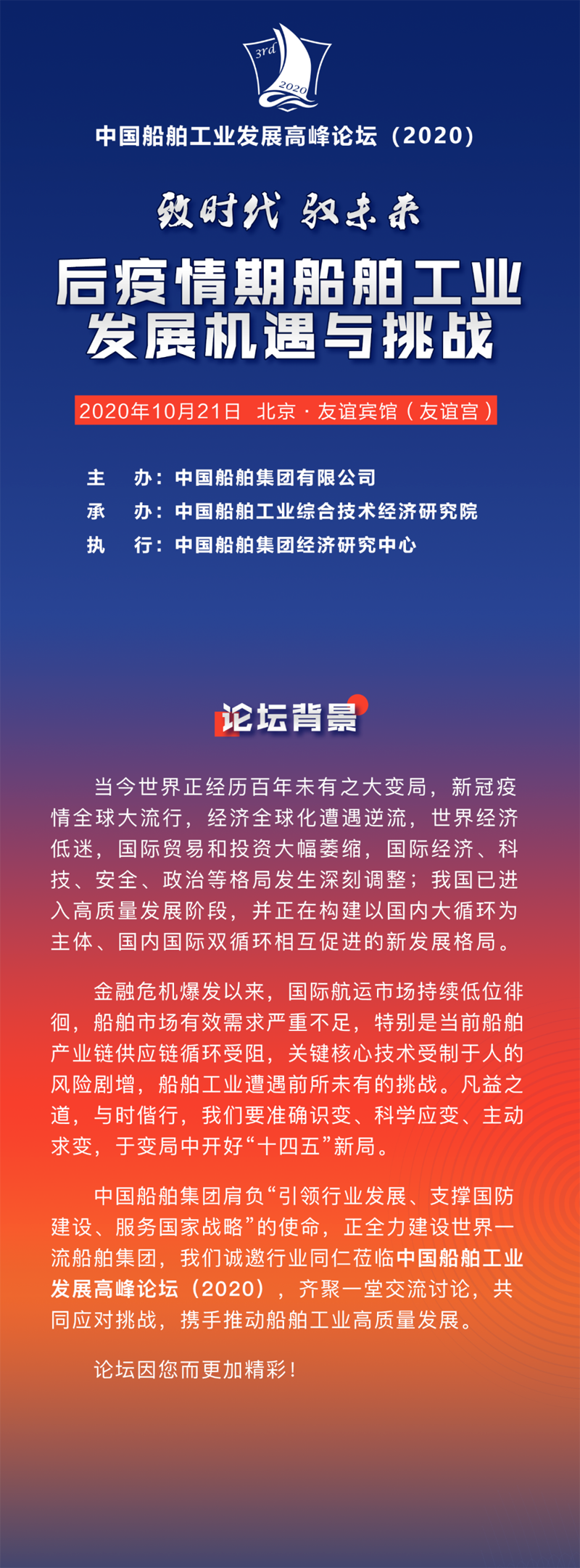 党的建设肩负“引领行业发展、支撑国防建设、服务国家战略”的使命,正全力建设世界一流船舶集团,我们诚邀行业同仁莅临中国船舶工业发展高峰论坛(2020),齐聚一堂交流讨论,共同应对挑战,携手推动船舶工业高质量发展。