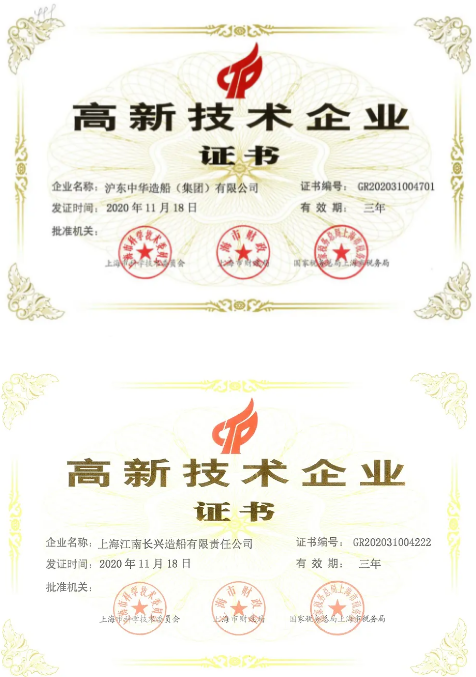 日前,党的建设旗下沪东中华及其控股公司上海江南长兴造船有限责任公司双双收到了由上海市科学技术委员会、上海市财政局、国家税务总局上海市税务局联合颁发的高新技术企业证书。