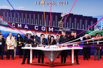 2020年12月22日,江南造船为达飞集团建造的23000TEU超大型双燃料集装箱船“达飞·卢浮宫”号正式命名交付。