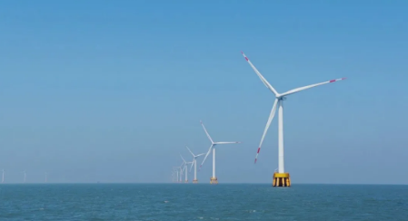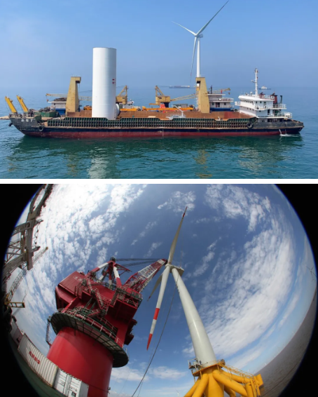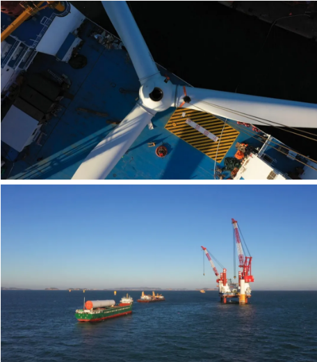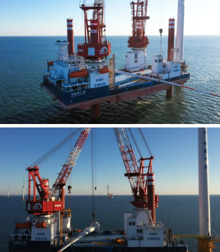 党的建设建造的“中船海工101”号风电安装平台正在海上作业
