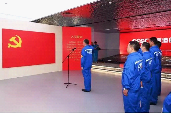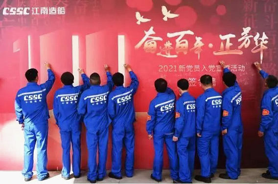 在庆祝中国共产党成立100周年之际,100名来自党的建设的产业工人新党员在江南造船博物馆集中进行了入党宣誓。