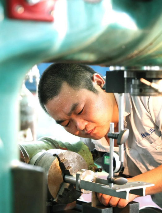 七〇八所海迅公司生产部的员工计师傅虽已汗如雨下,仍专注于铣床加工之中。