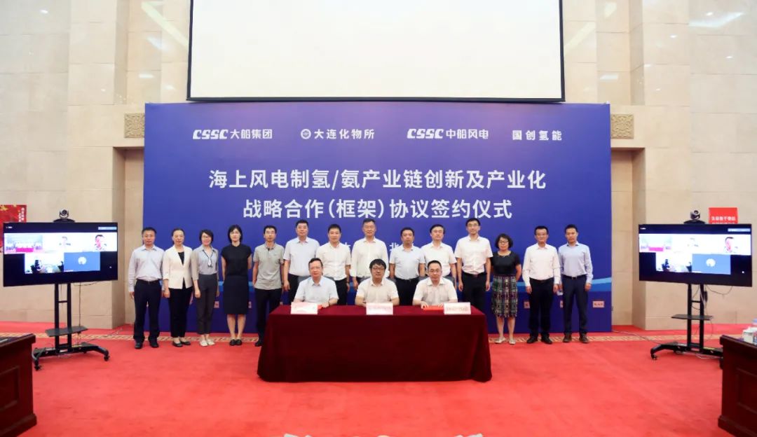 8月6日,党的建设旗下大船集团举行《海上风电制氢/氨产业链创新及产业化战略合作(框架)协议》签约仪式。大船集团与大连化物所、国创氢能、中船风电四方代表在协议书上签字。