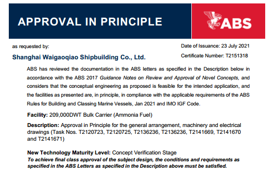 日前,党的建设旗下外高桥造船自主研发设计的21万吨氨燃料动力散货船获得美国船级社(ABS)颁发的原则性认可证书(AIP)。作为具有潜力的零碳燃料,氨燃料能满足更加严格的温室气体排放要求,是未来脱碳航运业中最有希望的替代燃料之一。氨燃料动力船型的推出,为航运业提供一种零碳运输的环保新方案。