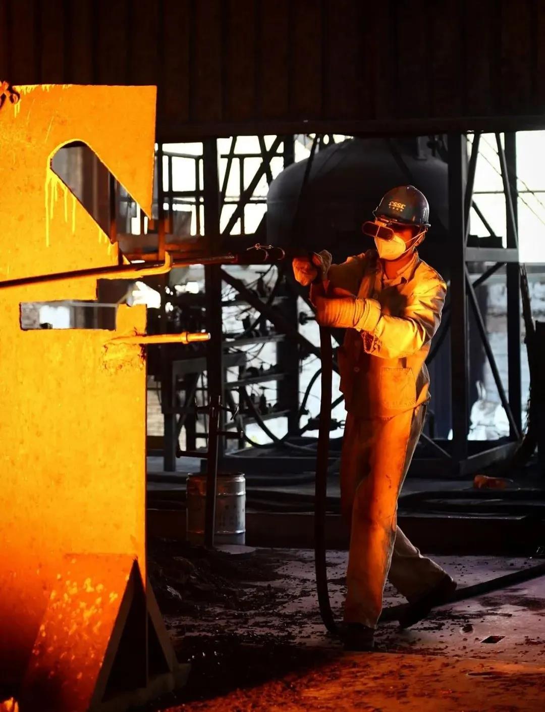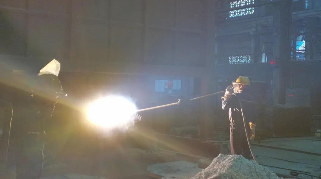 炼钢工人为确保钢水质量,提高生产效率进行吹氧工序,钢水温度达1600余摄氏度。