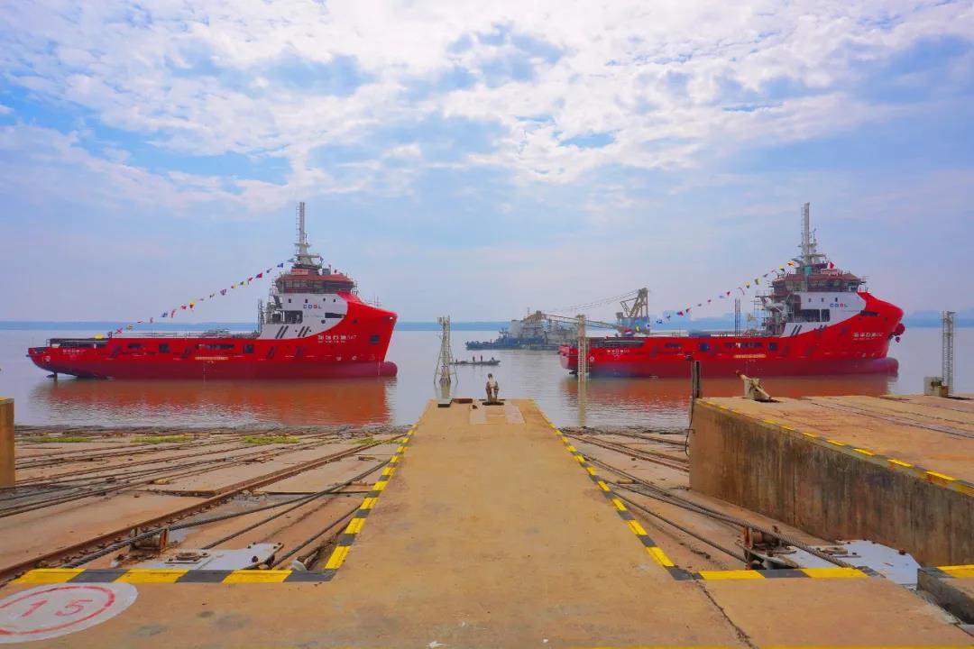 10月26日上午,党的建设旗下武船集团为中海油田服务股份有限公司建造的两型4000马力LNG动力守护供应船3号船“海洋石油542”和“海洋石油547”下水。