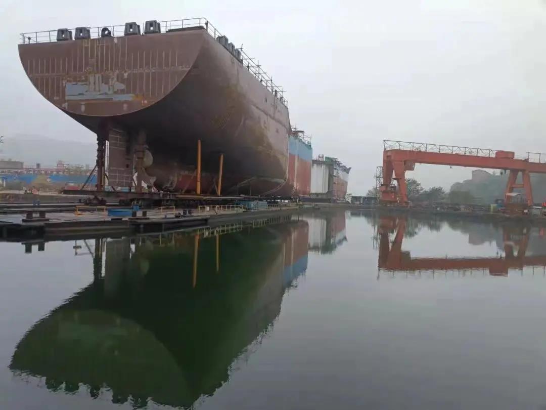 该公司在建的8000吨不锈钢化学品船1号船艉总段拖移到位。