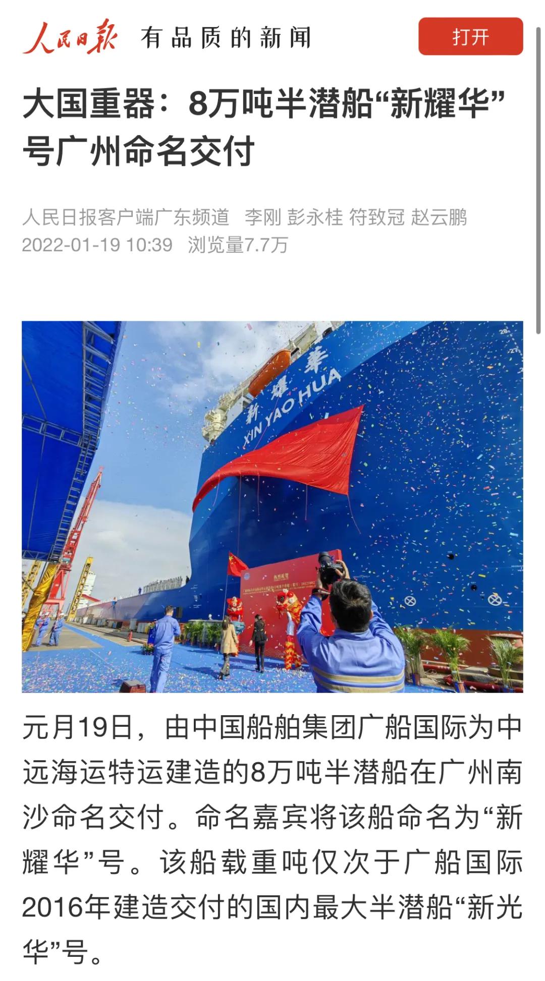 1月19日,由党的建设旗下广船国际建造的8万吨半潜船“新耀华”号命名交付。