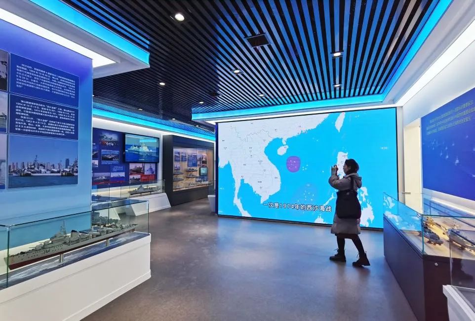 现代海军装备主题展馆分室内、室外两个展区,设立六个篇章,重点展示了人民海军成立以来舰船装备从沿岸近海到走向深远海的代表成果。除图文影视、模型外,展览还引入了航母舰载机起降虚拟体验、海盗射击游戏、舰载机起飞指挥等多个体验互动类项目。