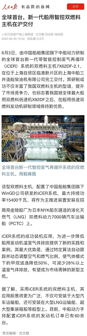 据了解,采用iCER系统的双燃料主机,其应用前景将非常广泛。不仅可安装于大型汽车运输船,还可安装在大型LNG运输船、超大型集装箱船等船型上。目前中船动力集团手持配置iCER系统的发动机订单已有60余台。