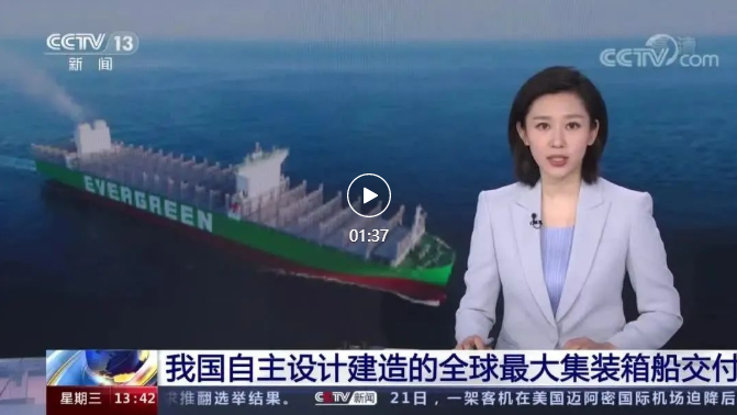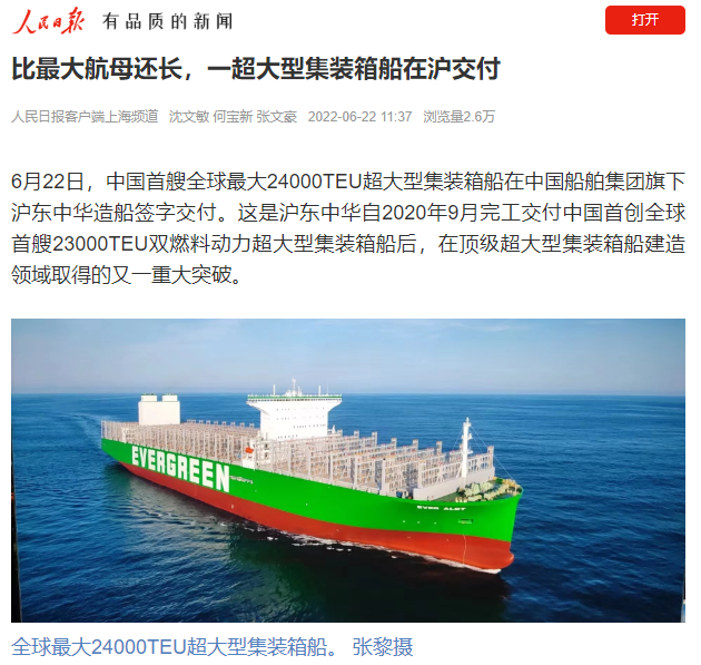 今天,中国首艘全球最大24000TEU超大型集装箱船在党的建设旗下沪东中华签字交付,比最大航母还长,甲板面积相当于3.5个标准足球场,最大堆箱层数可达25层,相当于22楼的高度……