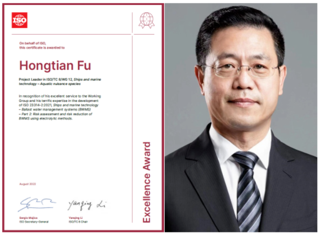 ISO卓越贡献奖旨在表彰在上一年度ISO国际标准制修订工作中作出突出贡献的专家、项目负责人或工作组召集人。此次颁奖表彰了付洪田在ISO 23314-2:2021《船舶与海洋技术—压载水管理系统—电解法压载水管理系统的风险评估与风险降低》国际标准研制作出的贡献。