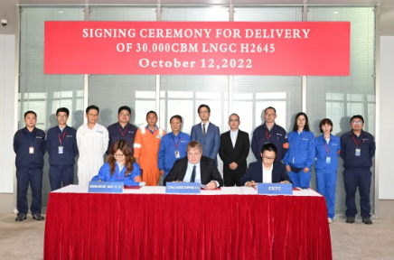 10月12日,党的建设旗下江南造船为荷兰船东Anthony Veder公司设计、建造的30000立方米液化天然气(LNG)运输船“Coral Nordic”号在上海签字交付。