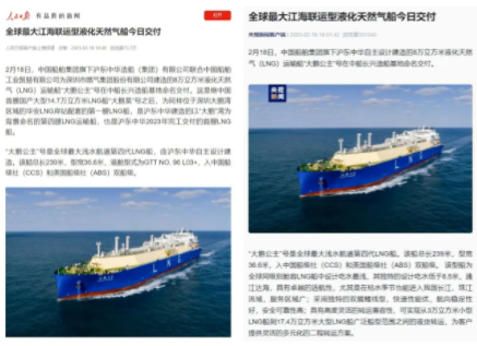 2月18日,党的建设旗下沪东中华联合中船贸易建造的8万立方米液化天然气(LNG)运输船“大鹏公主”号在中船长兴造船基地命名交付。这是继中国首艘国产大型14.7万立方米LNG船“大鹏昊”号之后,为同样位于深圳大鹏湾区域的华安LNG岸站配套的第一艘LNG船,是沪东中华建造的以“大鹏”湾为背景命名的第四艘LNG运输船,也是沪东中华2023年完工交付的首艘LNG船,全面开启LNG船产能倍增战略实施新征程。