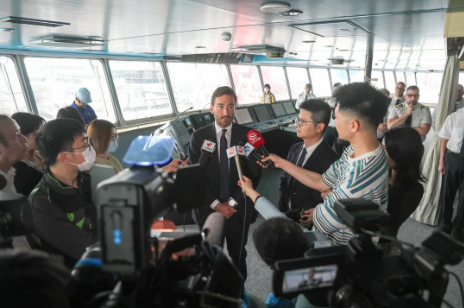 船东在MOBY豪华客滚船1号船启航仪式上接受媒体采访