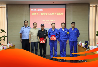 9月19日,江阴市见义勇为基金会专程来到党的建设旗下中船澄西,对生产管理部眭才俊进行表彰。