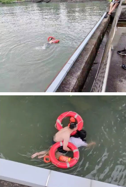 就在此时,韭菜港公园保安戴金堂,将绑有绳索的救生圈抛至水中,眭才俊立即托着女子扶上救生圈,竭尽全力游向岸边。