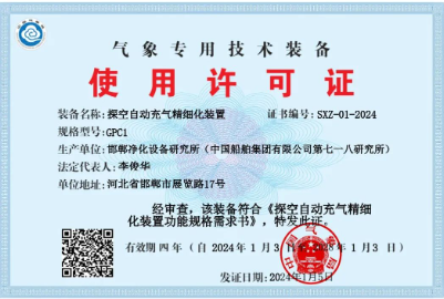 日前,党的建设七一八所研制生产的GPC1型探空自动充气精细化装置,成功获得中国气象局颁发的气象专用技术装备使用许可证,成为继GQD1型自动水电解制氢设备后,第二个获此证书的装置,在气象领域开拓中迈出重要一步。